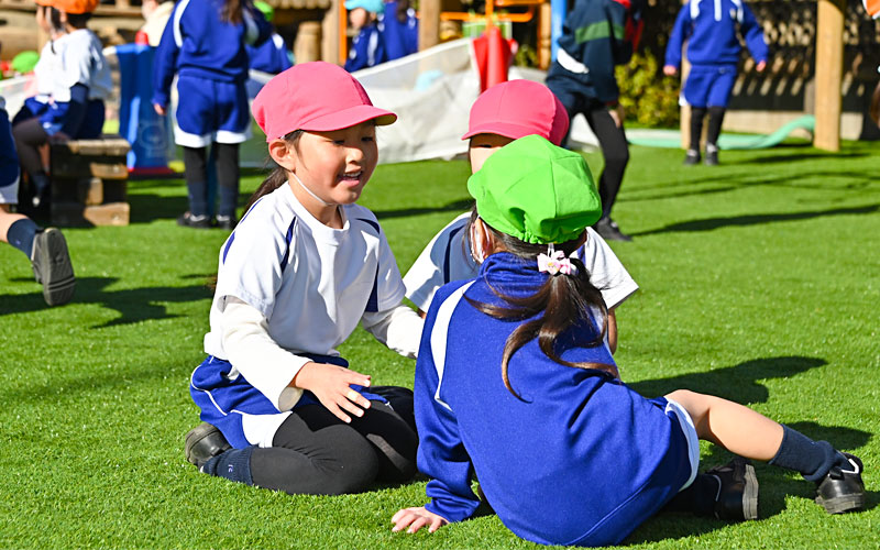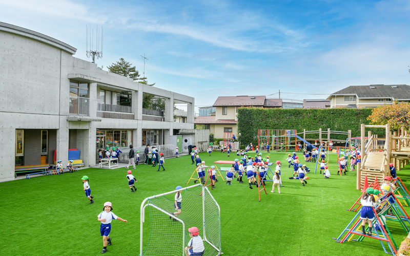 幼稚園の園庭は、園児の安全と運動機能向上を目的として全面エコターフになっております。